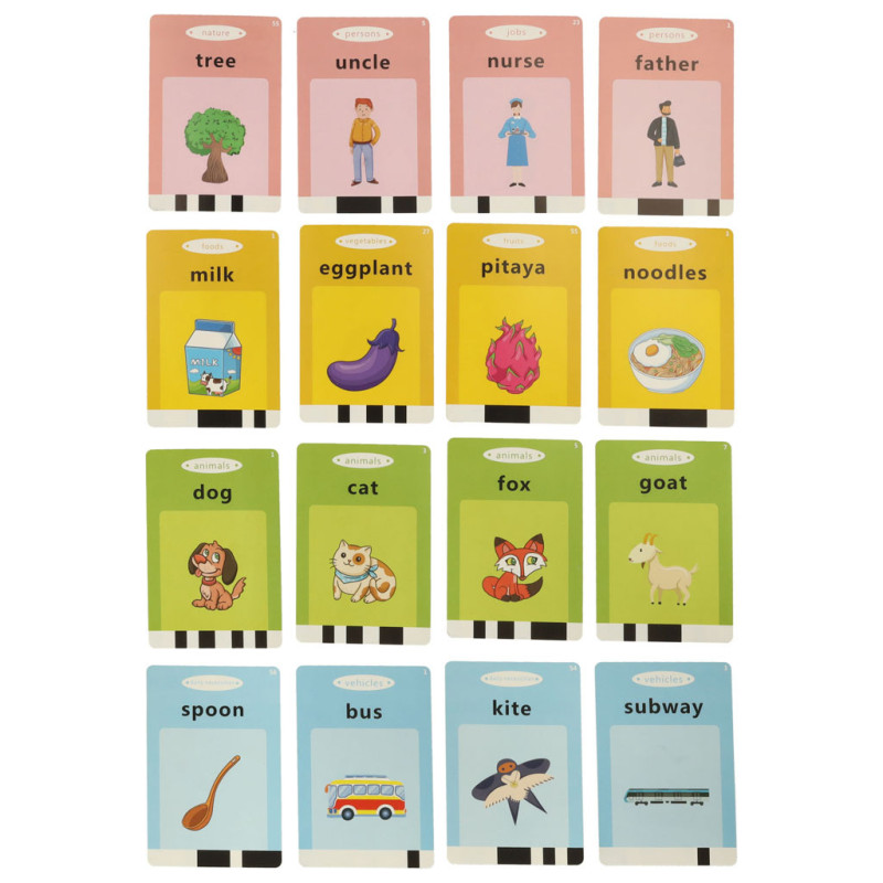 Každá z 112 dvojstranných kariet obsahuje 2 slovíčka a ilustračný obrázok. Dieťa tak môže počúvať výslovnosť a zároveň vidieť, čo slovo znamená.