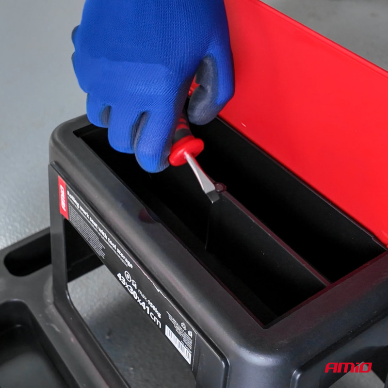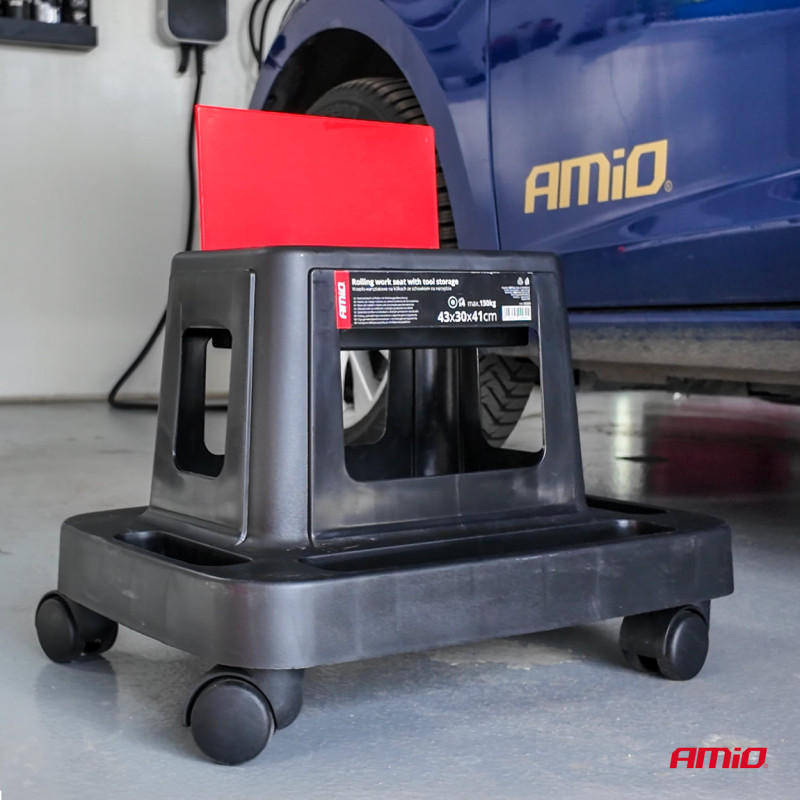 Dielenská stolička na kolieskach s úložným priestorom na náradie 150 kg AMiO-04268 je praktický a stabilný pomocník do dielne, garáže alebo domácnosti. Je vhodná na dosiahnutie vyšších polôh pri práci, ako aj na sedenie počas prestávok.