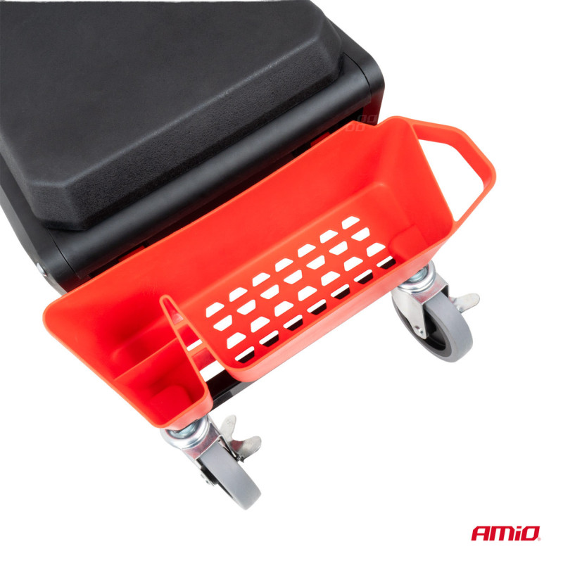 Dielenská stolička na kolieskach s úložným priestorom na náradie 150 kg AMiO-04268 je praktický a stabilný pomocník do dielne, garáže alebo domácnosti. Je vhodná na dosiahnutie vyšších polôh pri práci, ako aj na sedenie počas prestávok.