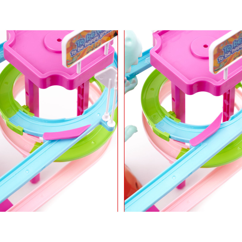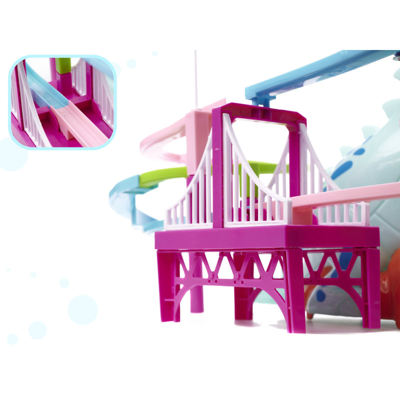 Hračka je vybavená zvukovými efektmi – keď malé autíčka prechádzajú cez trať, veľký dinosaurus zareve. Autíčka majú vlastný pohon, vďaka čomu sa môžu samostatne pohybovať po zakrivenej trati. Jediný spínač ovláda celý systém, čím sa hračka ľahko používa aj pre menšie deti.