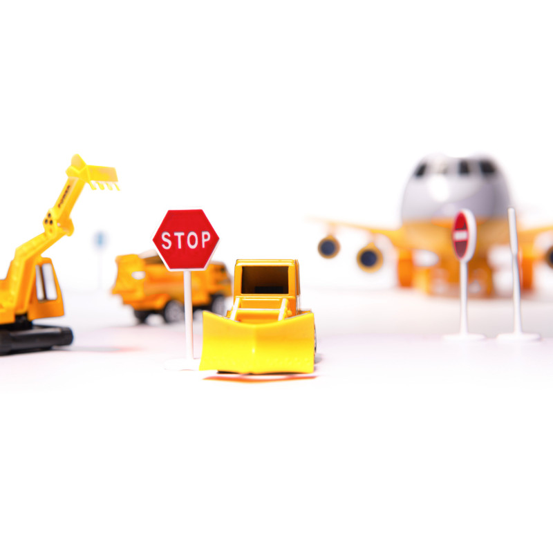 Poďme spolu postaviť nový dom... alebo rovno celú štvrť! Všetky potrebné stavebné stroje dopravíme letecky priamo na stavenisko. Veľké lietadlo má dostatok priestoru na prevoz stavebných áut a dopravných značiek, ktoré sú súčasťou balenia.