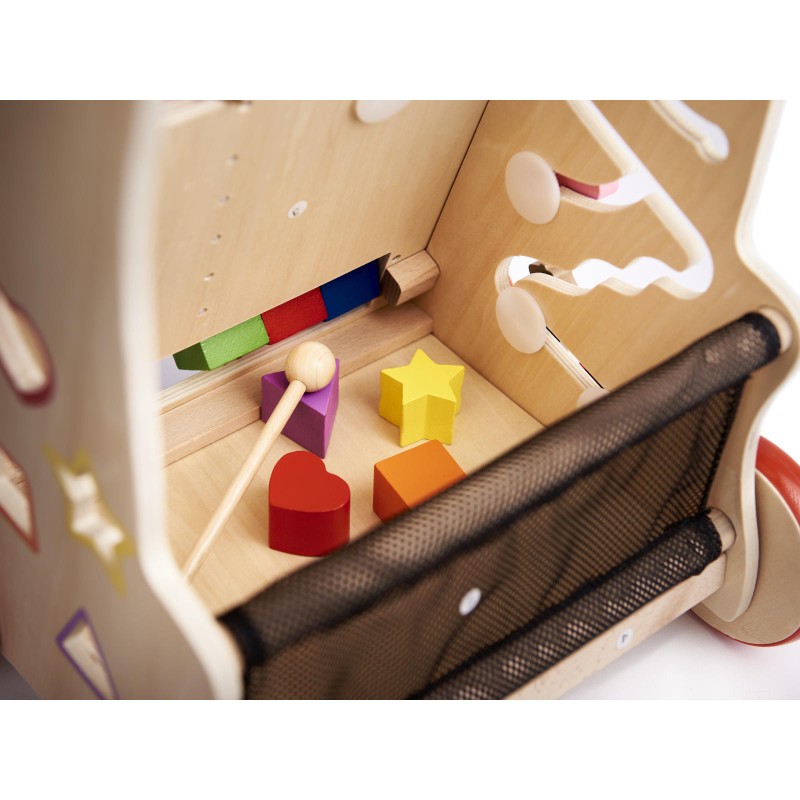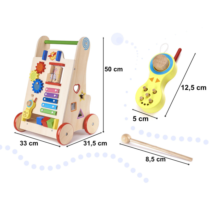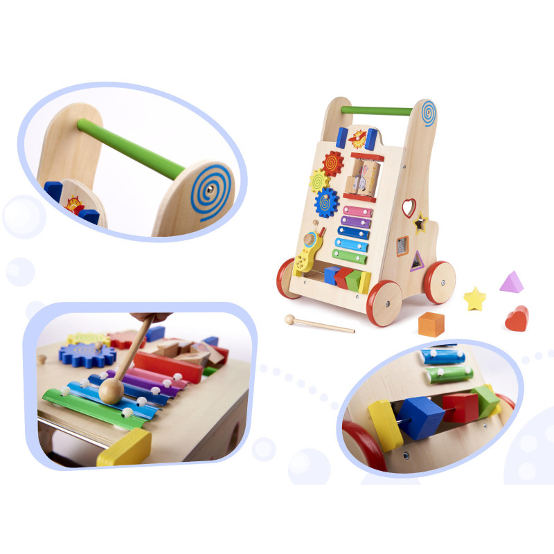 Toto krásne drevené chodítko podporuje rozvoj motoriky, rovnováhy a zmyslového vnímania dieťaťa. Ideálne ako prvá interaktívna hračka pre najmenších.