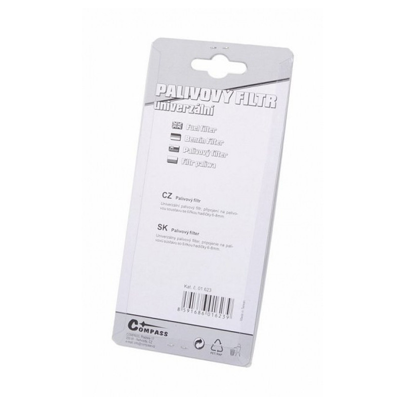Univerzálny palivový filter, pripojenie na palivovú sústavu s hadičkou o priemere 6-8mm.
