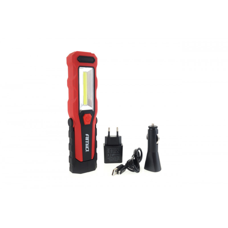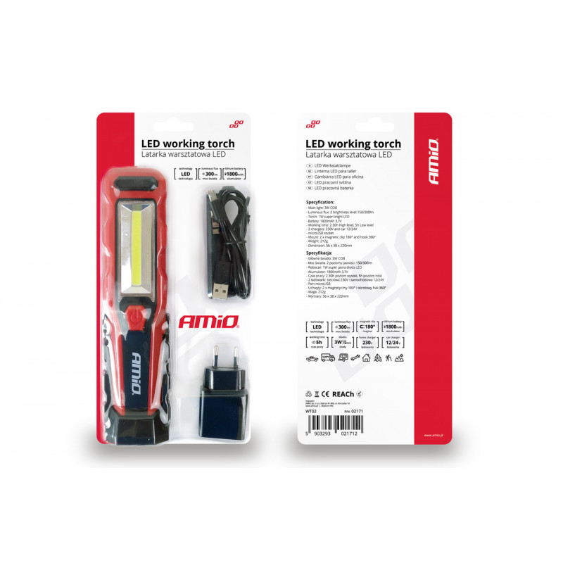 Technická špecifikácia: Hlavné svetlo 3W COB Svetelný tok 2 úrovne 150/300lm Pracovné 1W super jasná dióda LED Batéria 1800mAh 3,7V Pracovný čas 2,40 h - vysoká úroveň, 5 hodín - nízka úroveň 2 nabíjačky v sade 230V a 12/24V Zásuvka microUSB áno Držiaky magnetické 180 ° a háčik Hmotnosť 212 g Rozmer 56 x 38 x 220 mm Materiál ABS