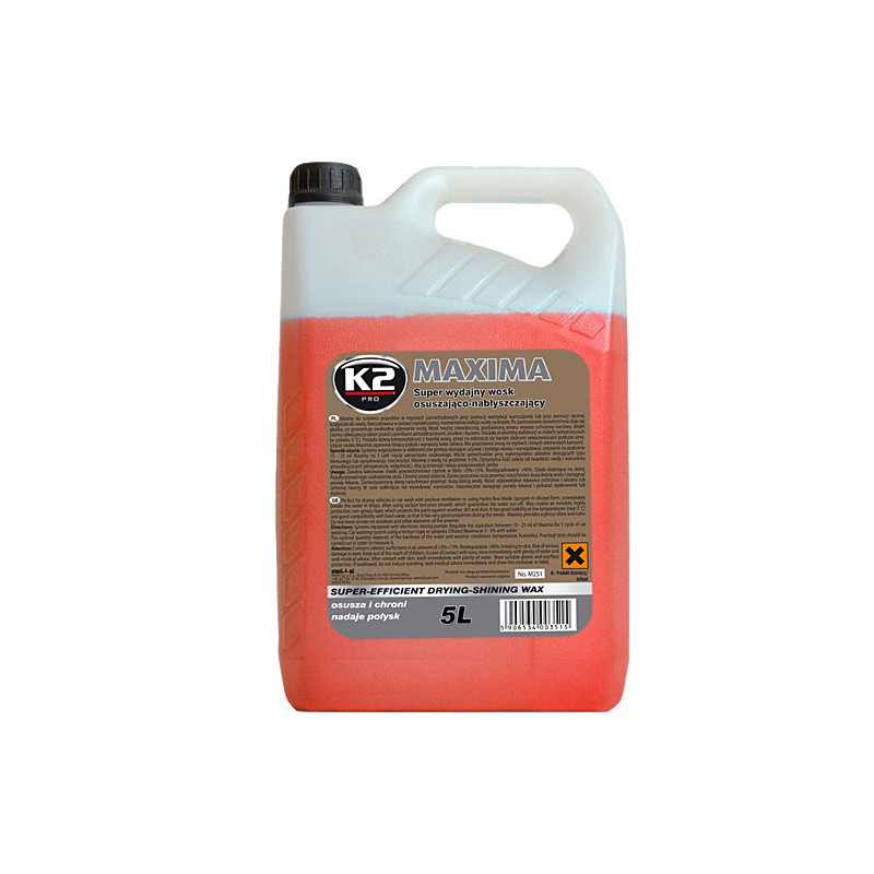 K2 MAXIMA – sušiaci vosk pre dokonalé odvodnenie a ochranu laku K2 MAXIMA je ideálny prostriedok na sušenie vozidiel v autoumyvárňach s nútenou ventiláciou alebo pri použití hydroflexi stierky. Po nastriekaní v zriedenej forme okamžite rozbíja vodu na kvapky, čím uľahčuje jej stekanie z povrchu. Vosk vytvára neviditeľnú, vysoko ochrannú a nemastnú vrstvu, ktorá chráni lak pred poveternostnými vplyvmi, nečistotami a prachom. Povrch zostáva hladký, čo zaručuje jednoduché sušenie a dlhodobú ochranu. Produkt má výbornú stabilitu aj pri nízkych teplotách (okolo 0 °C) a je kompatibilný aj s tvrdou vodou, vďaka čomu je skvelou voľbou na zimné obdobie. K2 MAXIMA dodáva karosérii vysoký lesk a intenzívne zvýrazňuje farbu, pričom nezanecháva šmuhy ani na oknách a ďalších vonkajších prvkoch.