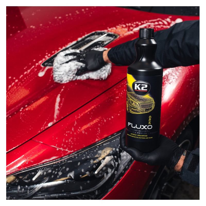 K2 FLUXO PRO – kyslý šampón na regeneráciu lesku a ochrany K2 FLUXO PRO je vysoko koncentrovaný, nízkopenivý šampón s kyslým pH (~4) určený na profesionálnu starostlivosť o vozidlá chránené keramickými, kremennými alebo voskovými povlakmi. Jeho jedinečné zloženie, bez zbytočných prísad, efektívne odstraňuje nečistoty a minerálne usadeniny, pričom obnovuje pôvodné hydrofóbne vlastnosti a hlboký lesk povrchov. K2 Fluxo premení váš lak a povrchy, ako by znovuzrodené z popola ako fénix!