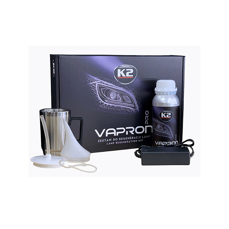 K2 VAPRON PRO – profesionálna sada na renováciu svetlometov K2 VAPRON PRO je profesionálna sada určená na obnovu a renováciu plastových svetlometov. Efektívne odstraňuje škrabance, zafarbenia a matovanie povrchu, čím navracia svetlometom ich pôvodný, bezchybný vzhľad. Vďaka obnove pôvodnej vrstvy polykarbonátu zaručuje sada trvácnu a odolnú regeneráciu. Výsledkom je nielen estetické vylepšenie, ale aj zlepšenie svetelného výkonu a bezpečnosti pri jazde. Produkt je určený výhradne na profesionálne použitie.