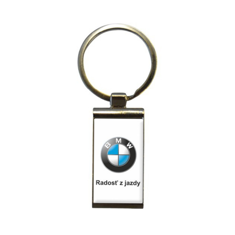 Kovová kľúčenka so živicovou nálepkou s logom auta.