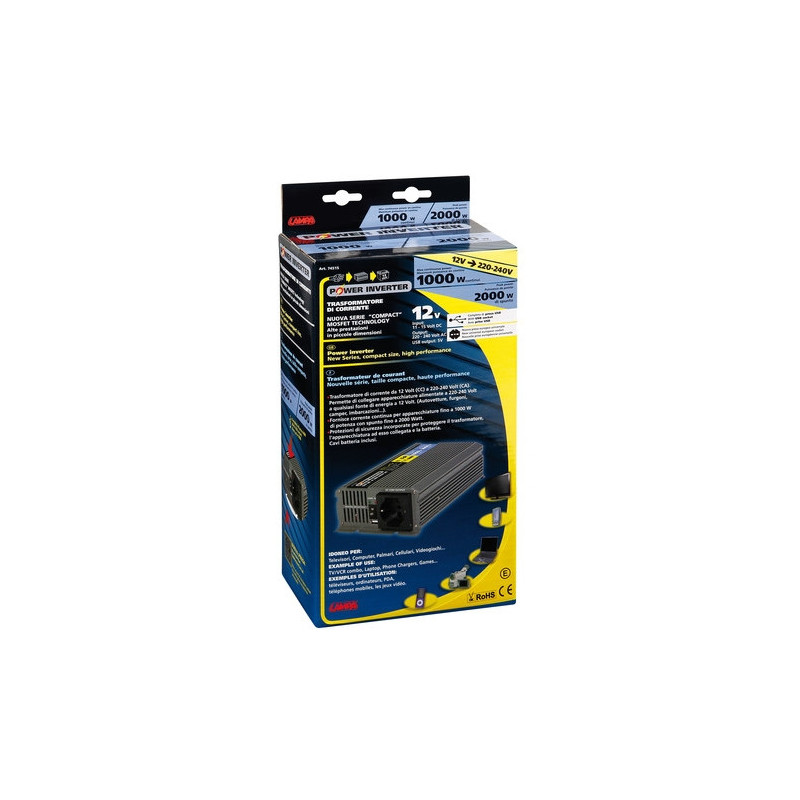 Zabezpečuje 220-240V AC napätie zo zdroja 12V DC. Hliníkový obal pre dlhšiu životnosť. Zabezpečuje konštantne vysoký výkon pri dvojnásobnej špičke. Pokročilý obvod, ktorý umožňuje zvládnuť aj zapínanie a vypínanie spotrebičov. Vstupné napätie: 11—15V DC, výstup AC 220—240V Ochrana pred skratom, prepätím, nadmerným odberom, prehriatím.