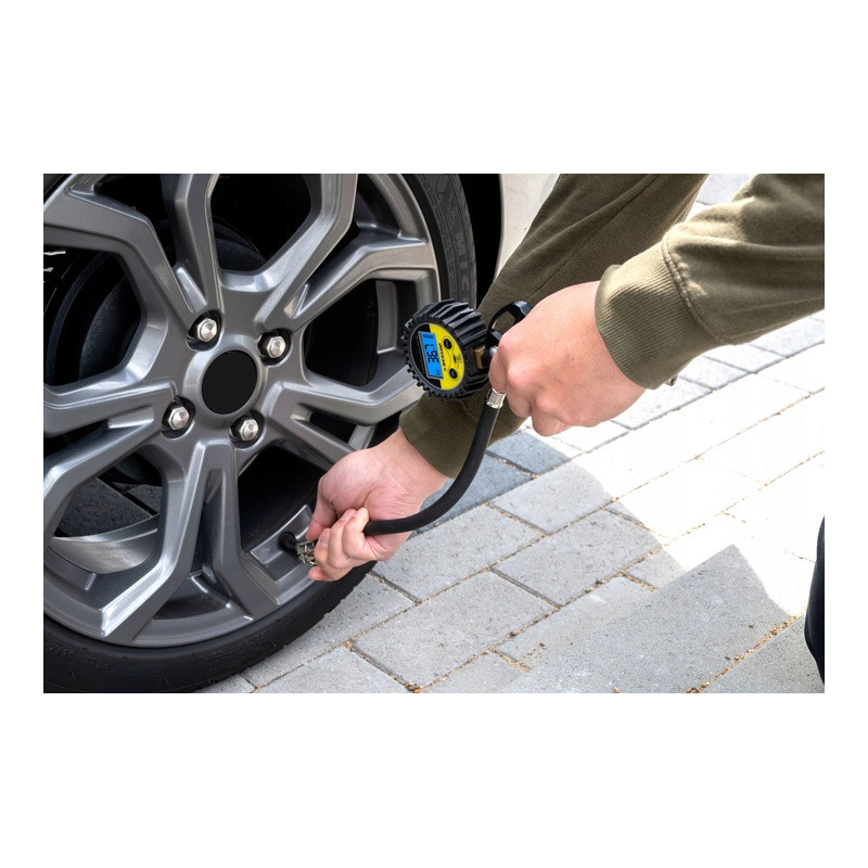 Presné meranie tlaku: Digitálny manometer poskytuje presné meranie tlaku v pneumatikách s vysokou presnosťou, čo zaručuje optimálne nafúknutie a bezpečnú jazdu. Zobrazenie tlaku je rýchle a jasné.