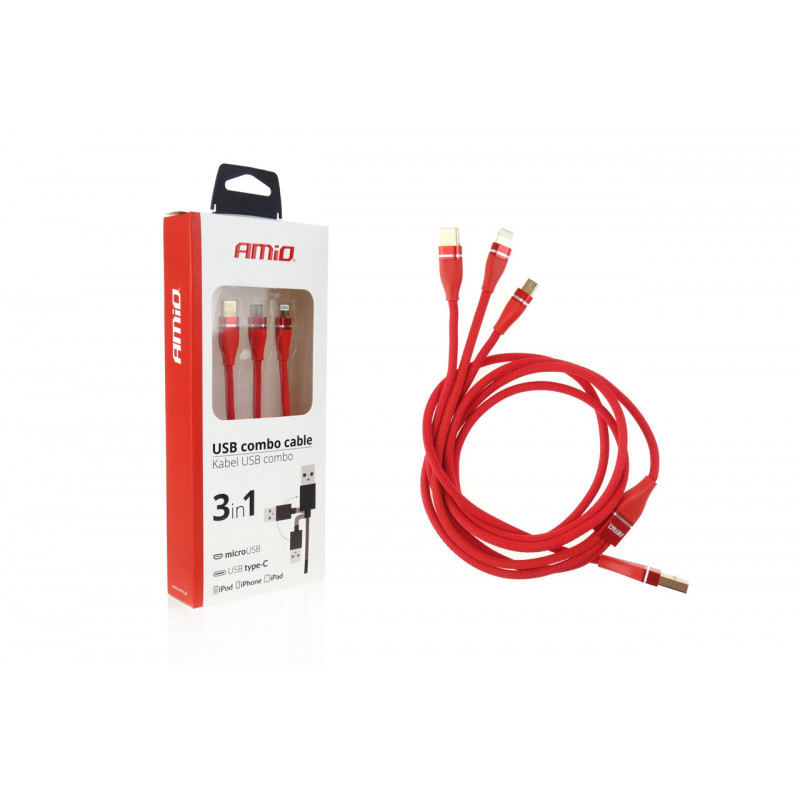 Textilný opletený kábel USB s 3 rôznymi koncami: Blesk (iPhone, iPad), USB typu C a microUSB Dĺžka kábla: 120 cm Maximálny nabíjací prúd: 3.1A Možnosť nabíjania viacerých zariadení súčasne
