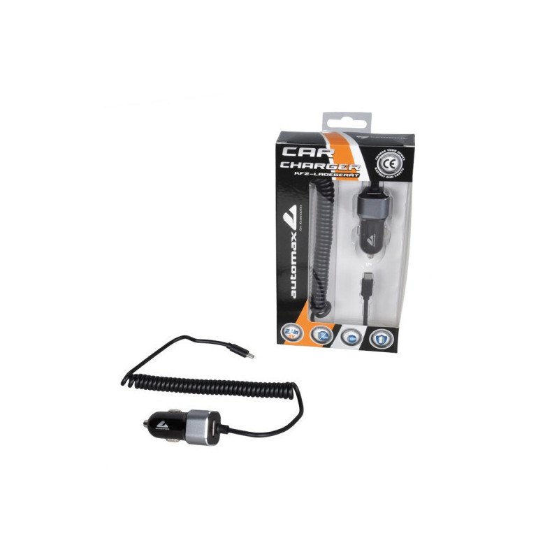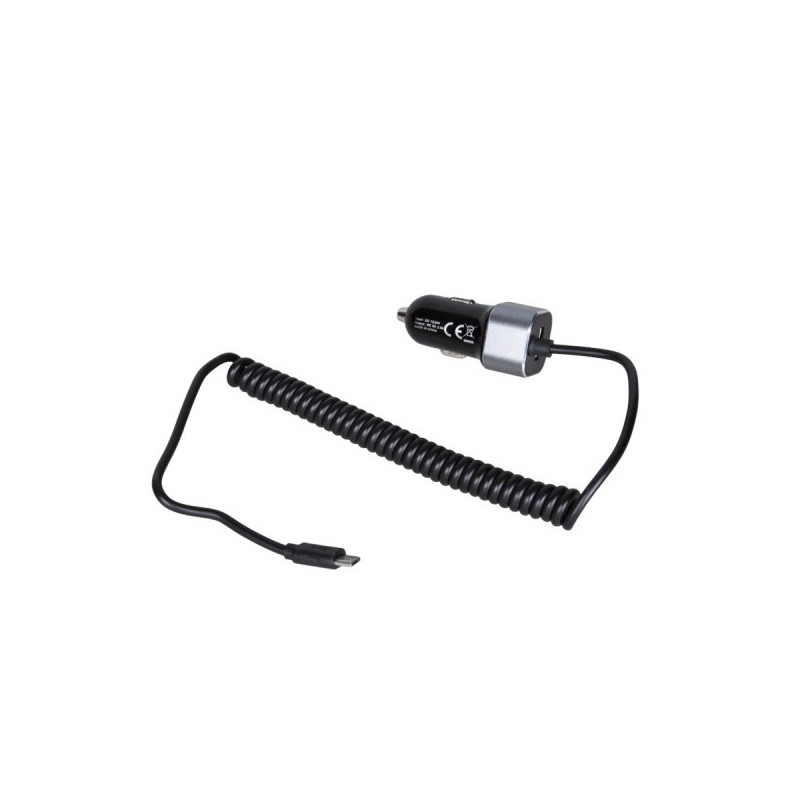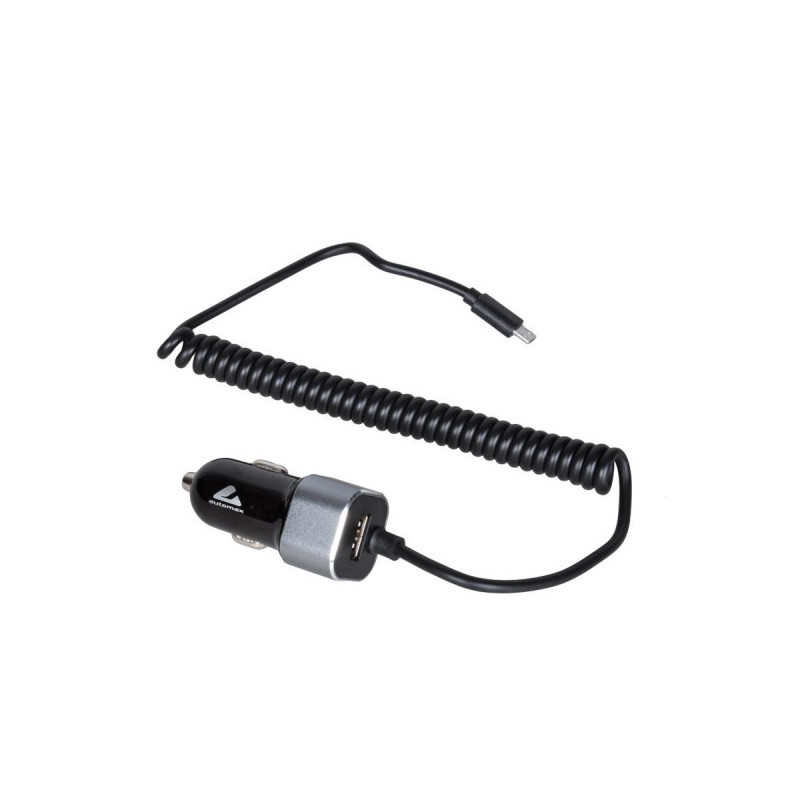 Univerzálna autonabíjačka do zdierky autozapaľovača pre osobné aj nákladné vozidlá s Mikro USB konektorom na špirálovom kábli + veľkým USB konektorom.