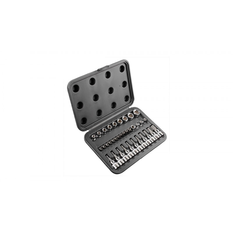 NEO 3/8 ' Nástavce Torx - sada obsahuje 34 kusov nástavcov, ktoré sa používajú hlavne na údržbu automobilov populárnych značiek. Všetky nástavce sú vyrobené zo silnej chróm-vanádiovej ocele, ...