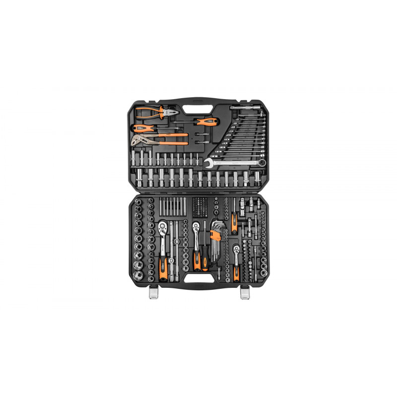NEO Nástrčné kľúče - najväčšia sada v ponuke. Zahŕňa 233 kusov veľkosti 1/2 ', 3/8' a 1/4 '. Je vyrobená z vysoko kvalitnej chróm-vanádiovej ocele. Kľúče sa dodávajú v pohodlnom a odolnom plastovom kufríku s kovovými svorkami a pohodlnou rukoväťou. Vo vnútri sa nachádza kompletná sada náradia: šesťhranné nástavce (plytké a hlboké), nástavce E, bity (rôzne konfigurácie vrátane predĺženia pre skrutky v hlbokých nástavcoch), šesťhranné kľúče, kombinované kľúče (veľkosti od 8 do 22 mm), adaptéry pre vŕtacie skrutkovače, 4 zásuvky pre zapaľovacie sviečky, príslušenstvo. Súčasťou sady sú tiež skrutkovače, kombinované kliešte a kliešte na rúrky, ktoré umožňujú prácu v situáciách, ktoré si vyžadujú neštandardné riešenia. Račne so sklonenou rukoväťou (3 kusy) majú 72 zubov, ktoré umožňujú prácu v obmedzenom prostredí. Kvalitu a spoľahlivosť náradia potvrdzuje 25-ročná záruka a medzinárodný certifikát TÜV. Značka NEO spĺňa očakávania profesionálov.
