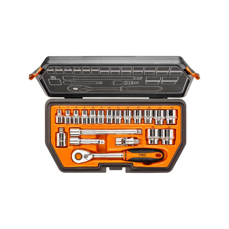 NEO Sada kľúčov 3/8 ' - 20 kusov vyrobených z vysoko kvalitnej chróm-vanádiovej ocele. Sada obsahuje račňu s odolným račňovým mechanizmom (48 zubov), širokú škálu nástavcov (veľkosť od 6 do 24 mm), predĺženie, spoj a adaptér 3/8'M x 1/2'F. Dodávané v praktickom púzdre. Kvalita náradia je potvrdená certifikátom TÜV a zárukou výrobcu na 25 rokov. Značka NEO spĺňa očakávania profesionálov.