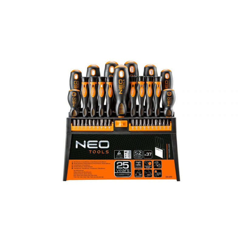 NEO Sada skrutkovačov a skrutkovacích nástavcov obsahuje 37 kusov najvyššej kvality. Hrot skrutkovačov je vyrobený z mimoriadne odolnej ocele S2, ktorá zaručuje dlhú životnosť. Skrutkovače majú magnetický hrot. Tvar trojramennej rukoväte s profilovanou opierkou na palec znižuje námahu pri práci a uľahčuje dosiahnutie správneho krútiaceho momentu. Protišmyková rukoväť vyrobená z dvoch materiálov je odolná voči chemikáliám, olejom a tukom. Kvalita nástroja je potvrdená zárukou výrobcu na 25 rokov. Uložené v praktickom stojane, čo uľahčuje skladovanie. Značka NEO spĺňa očakávania profesionálov.
