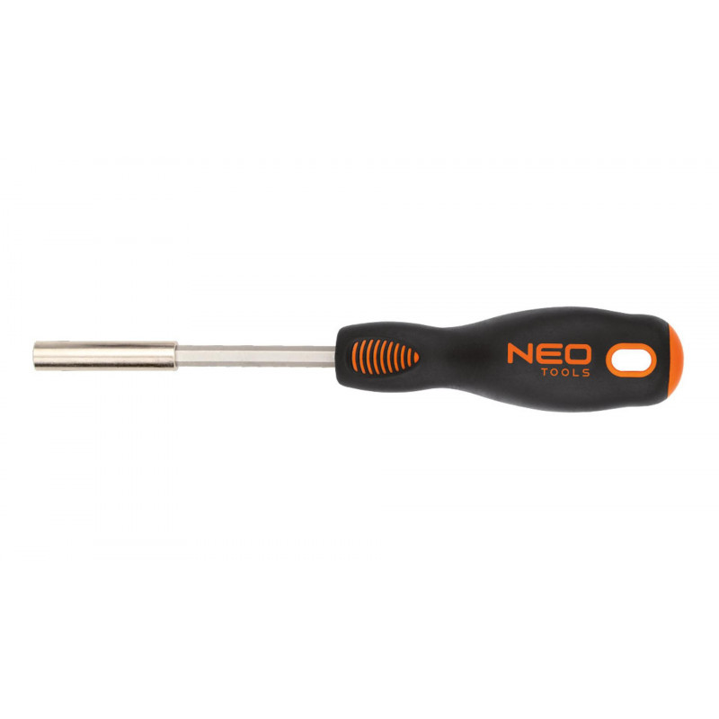 NEO Upínadlo na nástavce - rukoväť skrutkovača 1/4, dĺžka čepele: 100 mm. Čepeľ je vyrobená z odolnej chróm-vanádiovej ocele. Upínadlo má magnetický hrot. Rukoväť s profilovanou opierkou na palec znižuje namáhu pri práci a uľahčuje dosiahnutie správneho krútiaceho momentu. Spoľahlivosť produktu je potvrdená zárukou výrobcu na 25 rokov. Značka NEO spĺňa očakávania profesionálov.
