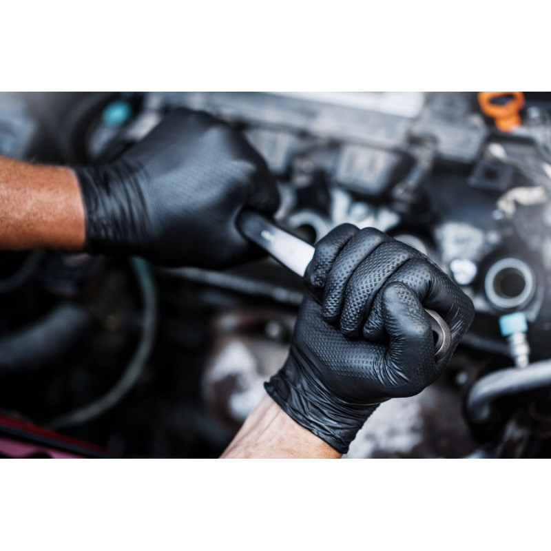 Nitrilové rukavice GoGrip čierne veľkosti XL, 50 ks sú profesionálne jednorazové rukavice vyrobené z odolného nitrilu, ideálne pre náročné pracovné podmienky. S trojnásobnou hrúbkou oproti štandardným rukaviciam a 3D diamantovou textúrou poskytujú vynikajúci úchop aj v mastnom alebo vlhkom prostredí. Tieto rukavice neobsahujú latex, sú bez púdru a spĺňajú normy EN ISO 374-1, EN ISO 374-2, EN ISO 374-4, EN ISO 374-5, EN ISO 16523-1 a EN ISO 21420, čo zaručuje vysokú ochranu proti chemikáliám a mikroorganizmom.