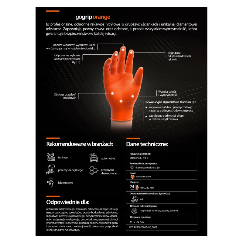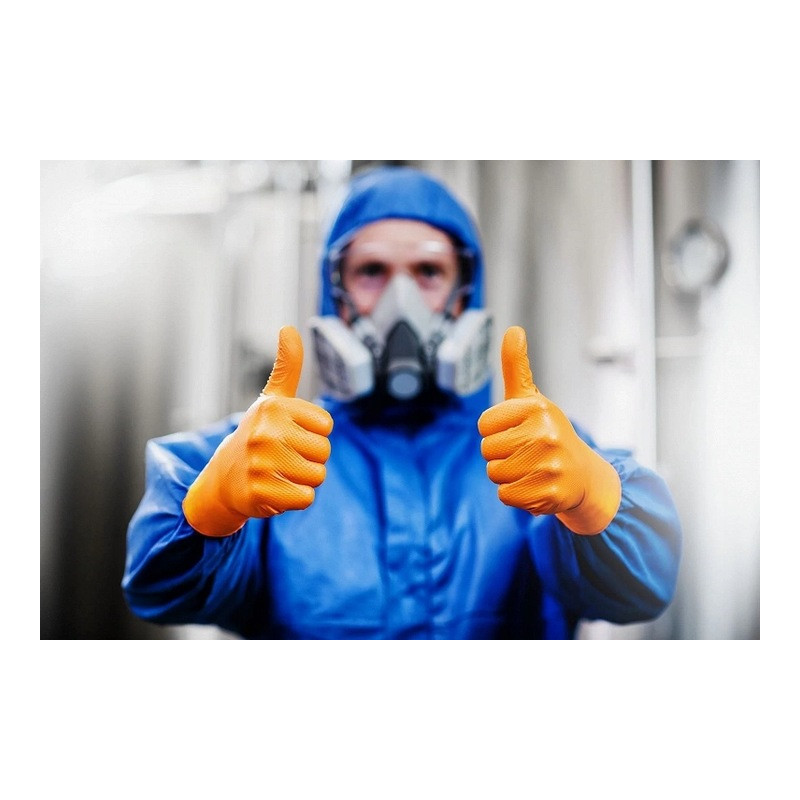 Nitrilové rukavice GoGrip oranžové veľkosti S, 50 ks sú špičkové jednorazové rukavice vyrobené z odolného nitrilu, ideálne pre náročné pracovné podmienky. Vyznačujú sa trojnásobnou hrúbkou oproti štandardným rukaviciam, 3D diamantovou textúrou pre vynikajúci úchop, a sú vhodné pre prácu v mastnom a vlhkom prostredí. Tieto rukavice neobsahujú latex, sú bez púdru a spĺňajú normy EN ISO 374-1, EN ISO 374-2, EN ISO 374-4, EN ISO 374-5, EN ISO 16523-1 a EN ISO 21420, čo zaručuje vysokú ochranu proti chemikáliám a mikroorganizmom.