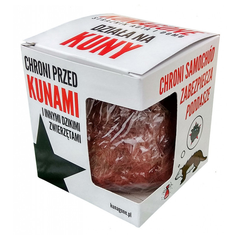 Patentovaný poľský výrobok, ktorý odoláva útoku kún na elektrickú inštaláciu vášho automobilu. Uvoľňuje prirodzený zápach psa (prirodzeného nepriateľa), ktorý vydesí nielen kuny, ale aj iné divé zvieratá.