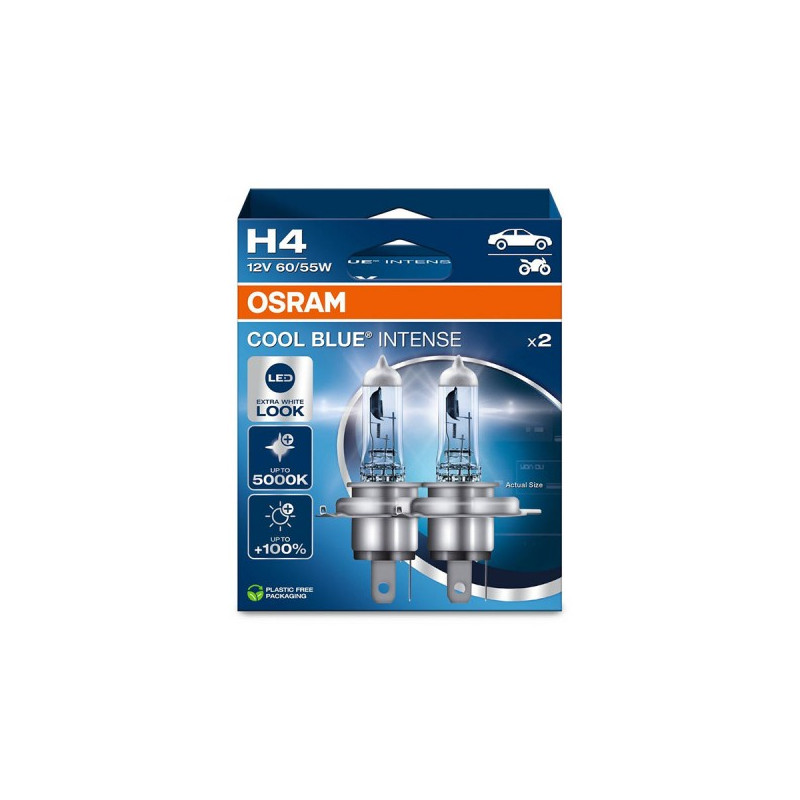 Žiarovka Osram Cool Blue Intense dokáže skvele imitovať xenónové svetlá vďaka vysokej svietivosti a jasnému bielo-namodralému svetlu. Toto svetlo vyzerá svoju modrením štýlovo a zároveň sa podobá z pohľadu vodiča dennému svetlu, a vám tak pri jazde v tme nič neunikne. Jedná sa o "najmodrejšie" halogénové žiarovky, ktoré možno legálne namontovať. V porovnaní so štandardnými halogénovými žiarovkami majú o 20% vyššiu intenzitu svetla. Môžete si tak dovoliť luxus omnoho drahších xenónových svetiel aj vo vašom aute.