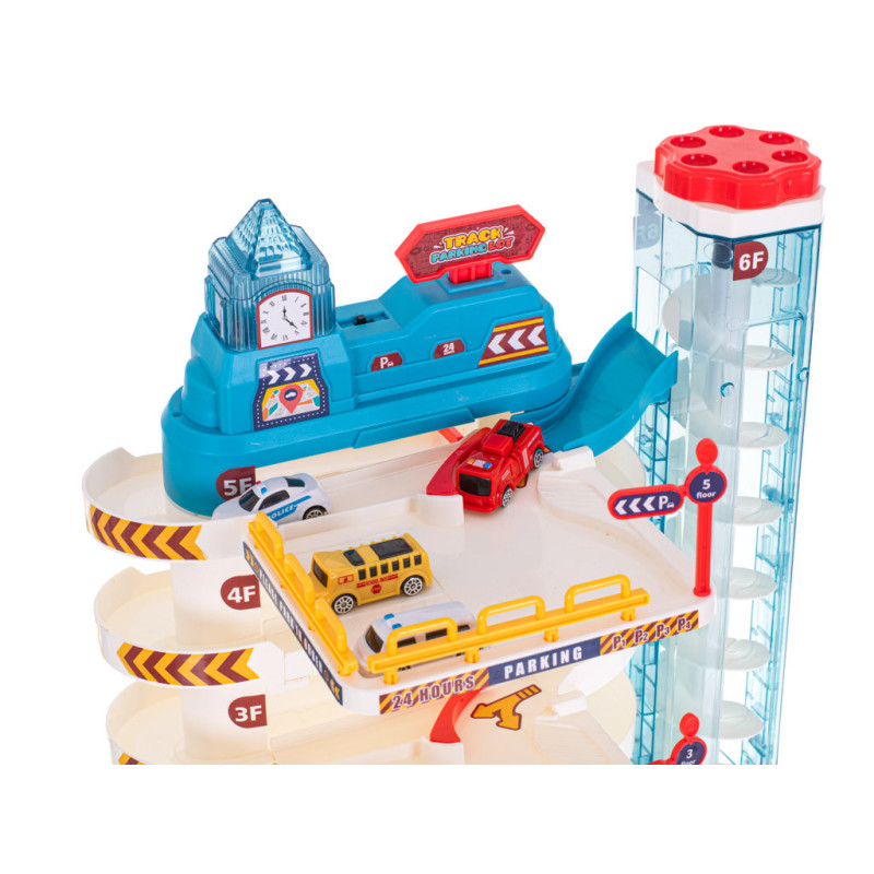 Garáž má až 5 poschodí, ktoré sú určené na parkovanie áut zo sady. Na úplný vrchol sa autíčka dostanú pomocou automatického výťahu s osvetlením. Počas jazdy hore blikajú farebné svetlá, ktoré spríjemnia každú jazdu.