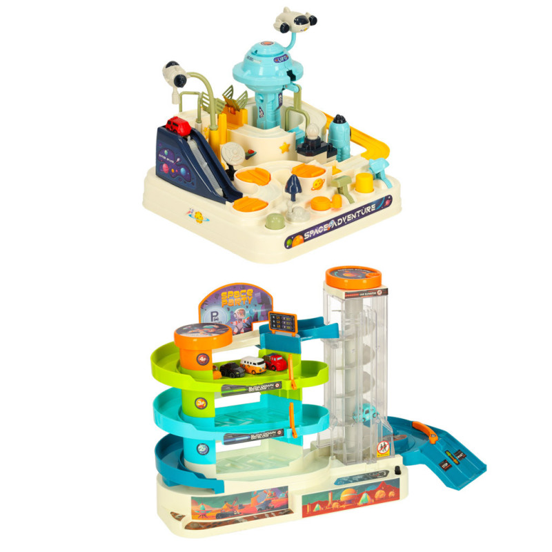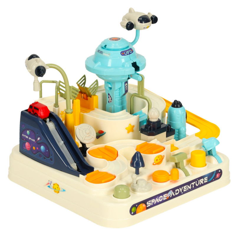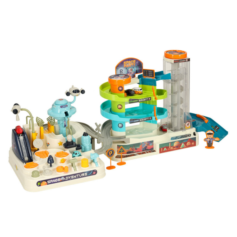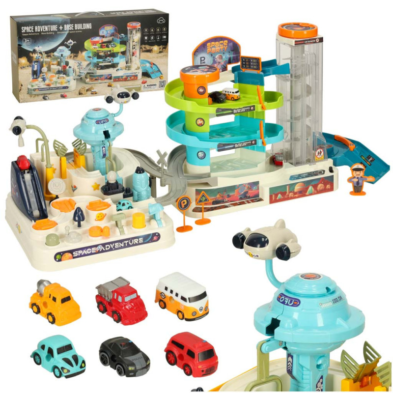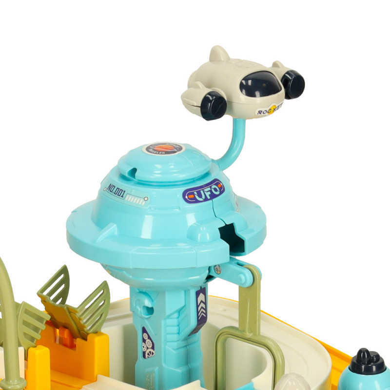 Vesmírna autodráha s viacerými úrovňami je ideálna hračka pre malých nadšencov vesmíru a áut. Vďaka interaktívnym prvkom si deti môžu dráhu upravovať podľa vlastných predstáv – točiť, posúvať a manipulovať s rôznymi časťami tak, aby šesť autíčok mohlo voľne jazdiť po trati.