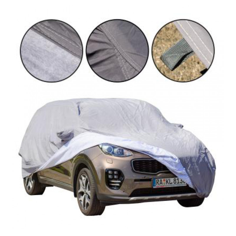 Nepremokavá plachta na auto chráni Váš automobil počas dažďa, snehu alebo prudkého slnka. Zabraňuje vyblednutiu farby vplyvom počasia. Ochráni auto pred slnečným žiarením. 4-bodový systém upevnenia vďaka všitej gume pre bezpečné uchytenie autoplachty. Vodeodolný, úžitokový alebo úložný vak( v praxi široké použitie napr. zabalenie predmetov).