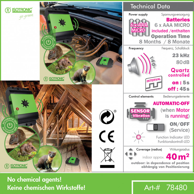Tento jedinečný plašič využíva najmodernejšiu technológiu ultrazvukových frekvenčných signálov, ktoré bezhlučne a netoxicky dokážu ochrániť vaše auto, dom, garáž, chalupu a iné. Po zapnutí vydáva odpudzovač zvuk s premenlivou frekvenciou. Signály ovplyvňujú nervový systém zvierat. Vyvolávajú strach, úzkosť a nedostatok orientácie v teréne. Zvieratá radšej opustia tento priestor. Prístroj je bezúdržbové bezdrôtové zariadenie, odolné voči zmenám poveternostných podmienok.