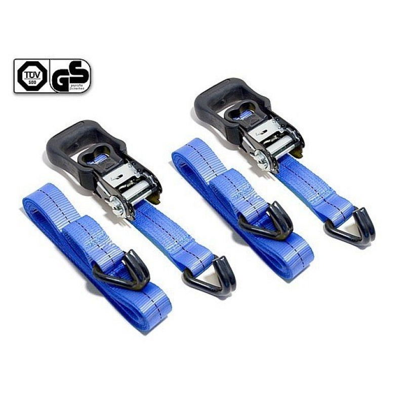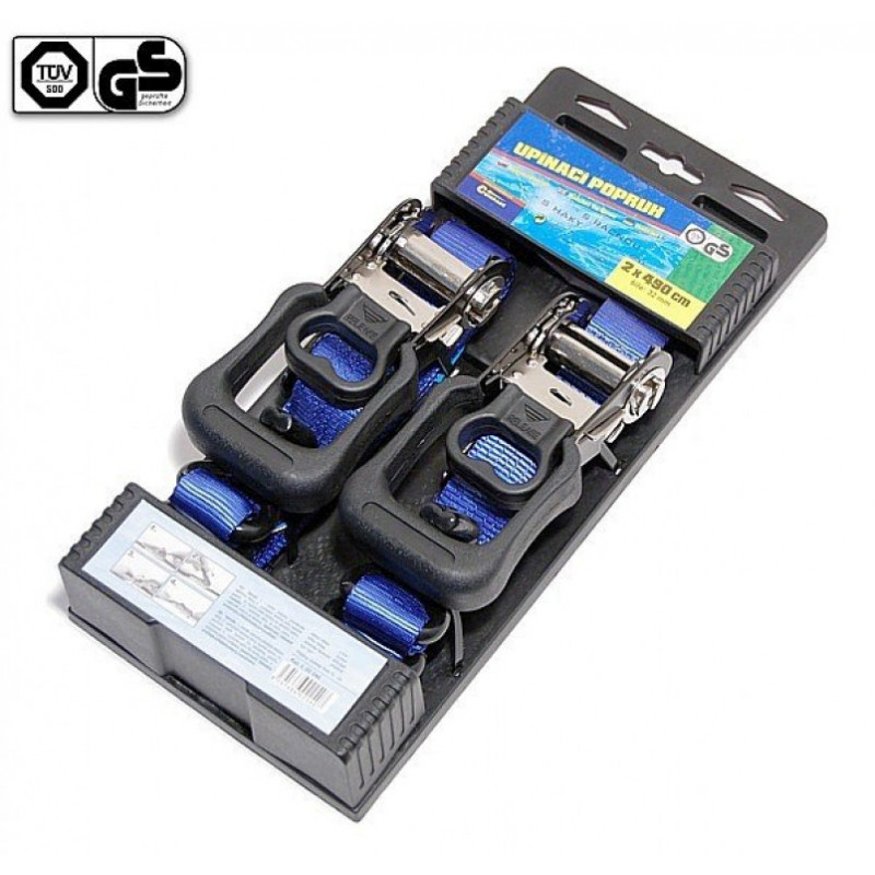 Upínací popruh vysokej kvality, homologizácia TÜV / GS. Kovové račne, úchyty potiahnuté tvrdeným plastom pre ľahšiu manipulaciu. Dĺžka: 4,9 m, šírka: 32 mm, ťažná sila: 400 N