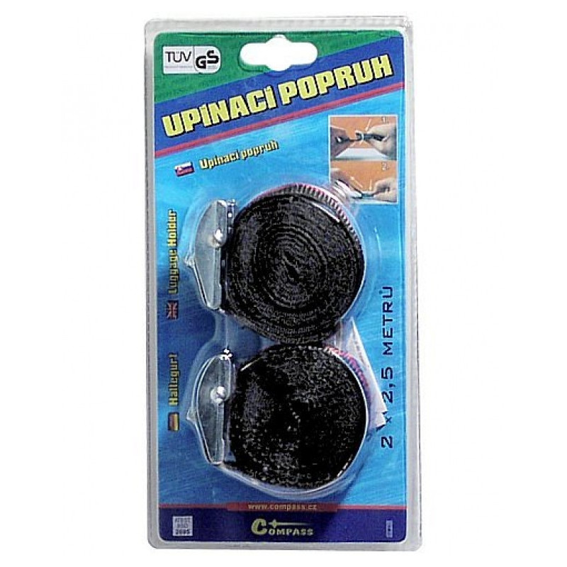 Upínacie popruhy vysokej kvality, s kovovou sponou, homologizácia TÜV / GS. Dĺžka 2,5 m, šírka 25mm, sada 2 kusy.