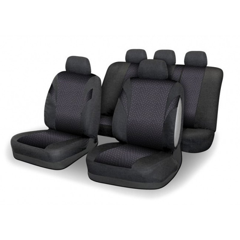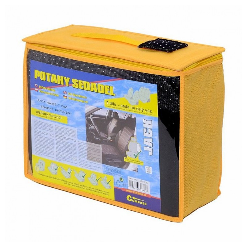 Poťahy sedadiel JACK, sada na celý automobil. Poťah je vyrobený zo spevneného podšitého materiálu v celej ploche, možno pripevniť na väčšinu bežne používaných automobilových sedadiel. Poťah možno použiť na sedadlách, ktoré majú zabudovaný bočný airbag priamo v operadle predných sedadiel. Balenie obsahuje poťah na predné sedadlo (2x), zadný sedák (celý), zadné operadlo (pomocou zipsu deliteľné na 3 diely), opierku hlavy (5x). Vďaka zipsom na zadnej operadlovej časti je možné poťahy použiť aj na vozidlá s delenými zadnými sedadlami a operadla sklápať bez nutnosti sňatí poťahu.