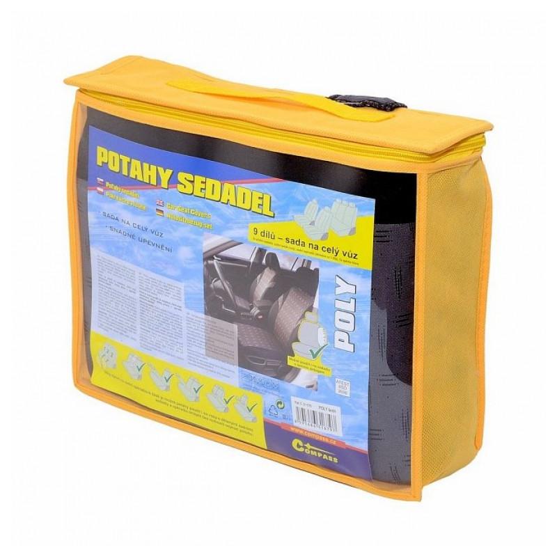 Poťahy sedadiel POLY, sada na celý automobil. Možno pripevniť na väčšinu bežne používaných automobilových sedadiel. Poťah možno použiť na sedadl&´ch, ktoré majú zabudovaný bočný airbag priamo v operadle predných sedadiel. Balenie obsahuje poťah na predné sedadlo (2x), zadný sedák (celý), zadné operadlo (pomocou zipsu deliteľné na 3 diely), opierku hlavy (5x). Vďaka zipsom na zadnej operadlovej časti je možné poťahy použiť aj na vozidlá s delenými zadnými sedadlami a operadla sklápať bez nutnosti sňatí poťahu.