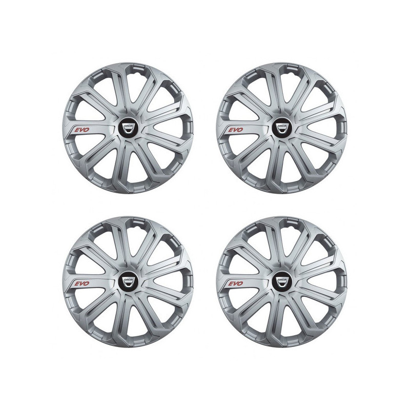 Puklice 14 Evo silver pre Dacia (staršie logo) na ocelové disky. Pre kolesá o veľkosti R14 so živicovými samolepkami Dacia (staršie logo).Получател :