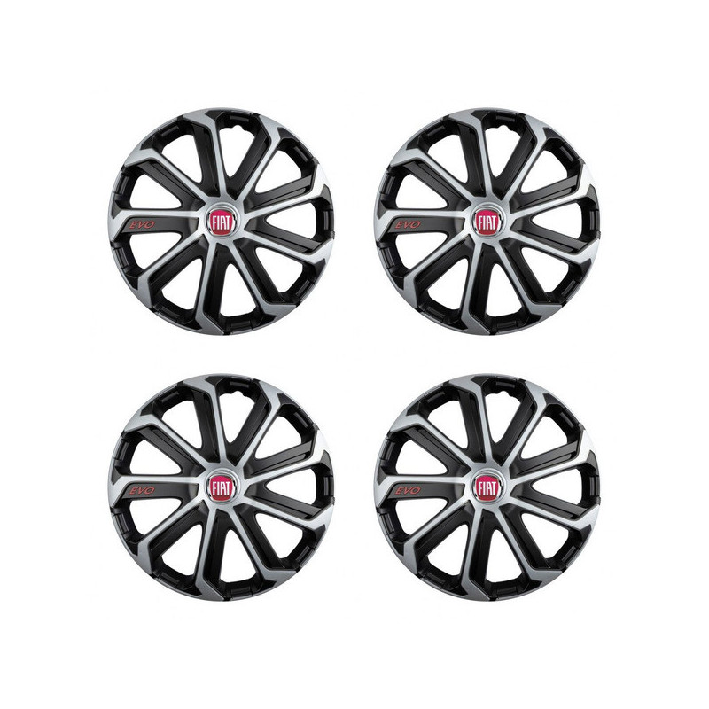 Puklice 15 Evo black&silver pre Fiat (červené) na ocelové disky. Pre kolesá o veľkosti R15 so živicovými samolepkami Fiat (červené).Получател :