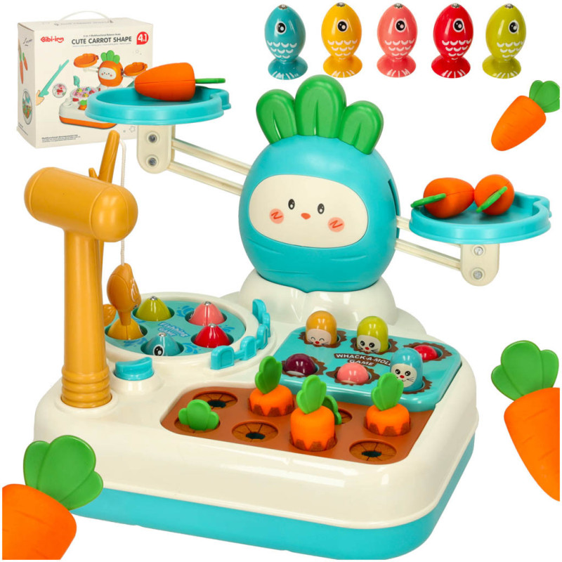 Interaktívna hračka v tvare mrkvy je zábavný a všestranný set, ktorý ponúka až štyri rôzne hry podporujúce logické myslenie, obratnosť a koordináciu. Deti si môžu zahrať na rybárov, zberačov mrkiev, triafať krtkov a vyvažovať váhu s farebnými prvkami.