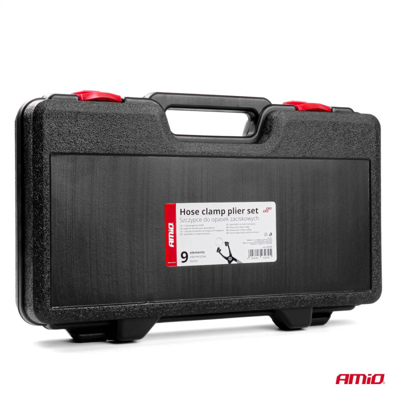 Sada klieští na hadicové spony 9 ks – AMiO-XXXX je profesionálna súprava náradia určená na efektívnu demontáž a montáž rôznych typov hadicových spon. Ideálna pre mechanikov, autoservisy a domácich majstrov, ktorí potrebujú spoľahlivé nástroje na prácu s hadicovými systémami v automobiloch, motorkách a iných zariadeniach.