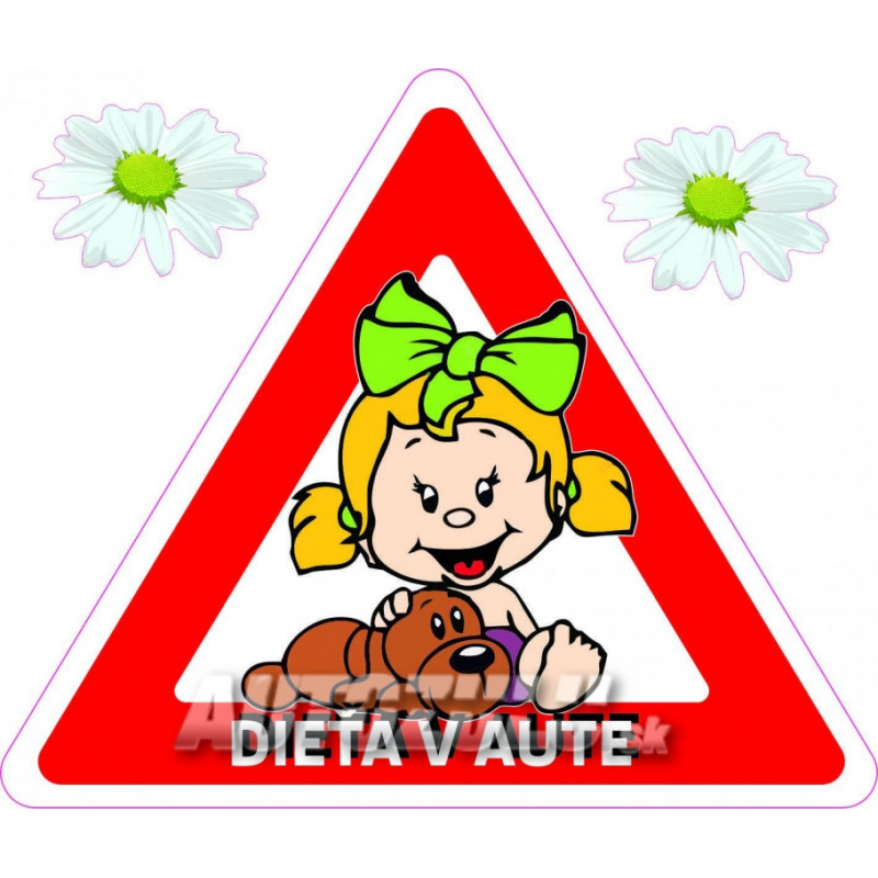 Červený trojuholník s podobizňou dieťaťa a nápisom DIEŤA V AUTE so psíkom, dievča vytlačené na reflexnej fólii.
