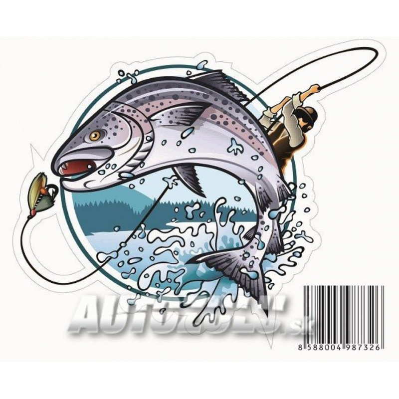 Krásna farebná tlačená samolepka rybár + pstruh. Tlačená na bielu fóliu.