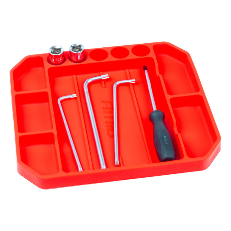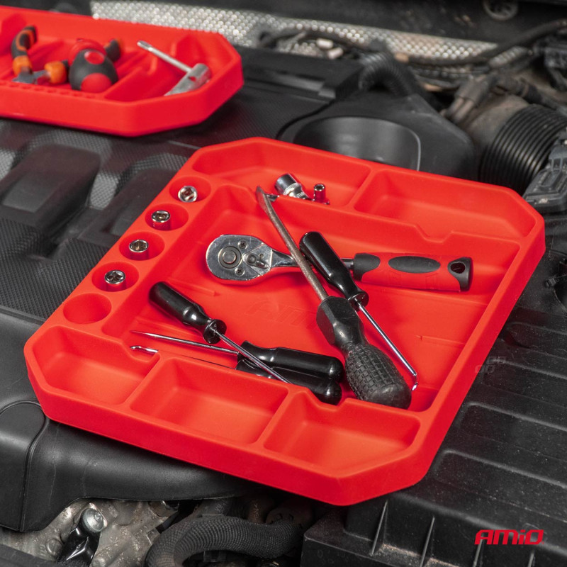 Silikónový zásobník na náradie AMiO-04271 je flexibilný a protišmykový podnos navrhnutý na bezpečné uskladnenie drobných súčiastok, náradia a príslušenstva počas práce v dielni, garáži alebo pri domácich opravách.