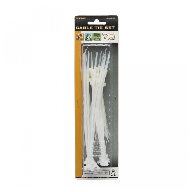 Materiál: Nylon 66 (94V.2) Typ: sťahovací Rozmery - počet - farba: 2.5 x 100mm - 25 ks - priehľadná 4.5 x 120mm - 25 ks - priehľadná 2.5 x 200mm - 25 ks - priehľadná