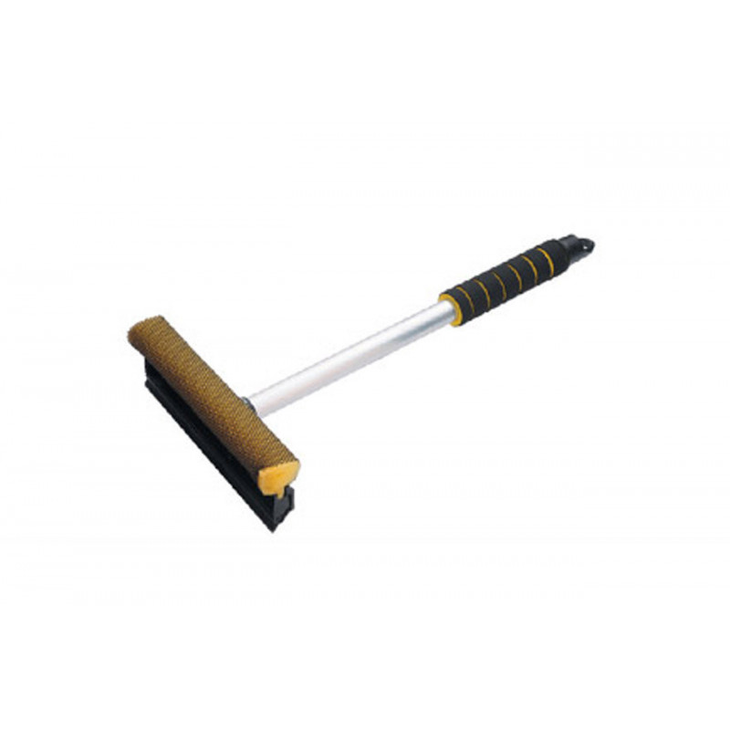 Praktická hliníková stierka s gumovým britom a zabudovanou hubou, hliníková rukoväť.