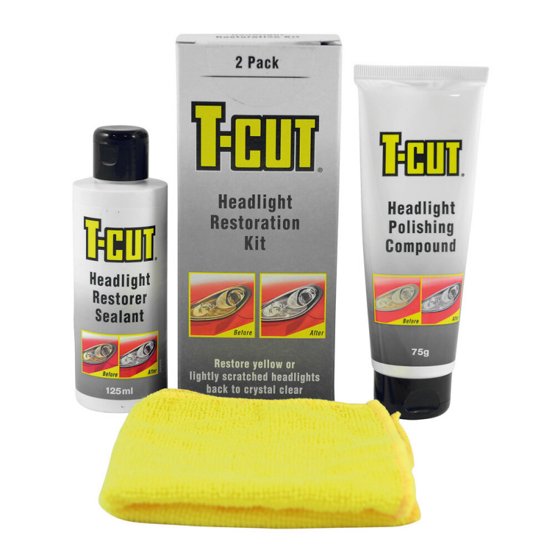 Sada na obnovu svetlometov T-Cut je kombináciou leštidla a tesnenia, ktoré vypĺňa drobné odreniny na plastovom kryte svetiel a zároveň leští jeho povrch, takže predné svetlomety vyzerajú opäť ako nové lesknú sa krištáľovo čistým leskom. Vyvinuté pre lepšiu viditeľnosť svetlometov a priepustnosť svetla odstránením škrabancov a zákalov na nepotiahnutých, priehľadných plastových svetlometoch. Kombinácia leštidla a obnovy tesnení poskytuje svetlometom vysoký lesk, lesk a ochranu. Sada obsahuje: leštidlo na svetlomety T-Cut 75g