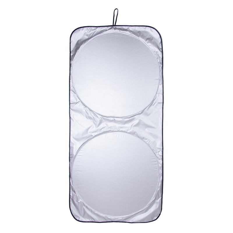 Blokuje UV žiarenie. Udržuje vozidlo chladnejšie. Súčasťou je vrecko pre ľahké uloženie. POKYNY: Vyberte zloženú clonu z vrecka. Rozbaľte elastický pásik zo zloženého tienidla a vložte ho pod čelné sklo. Posuňte clonu do čelného skla a nastavte pomocou pásikov.