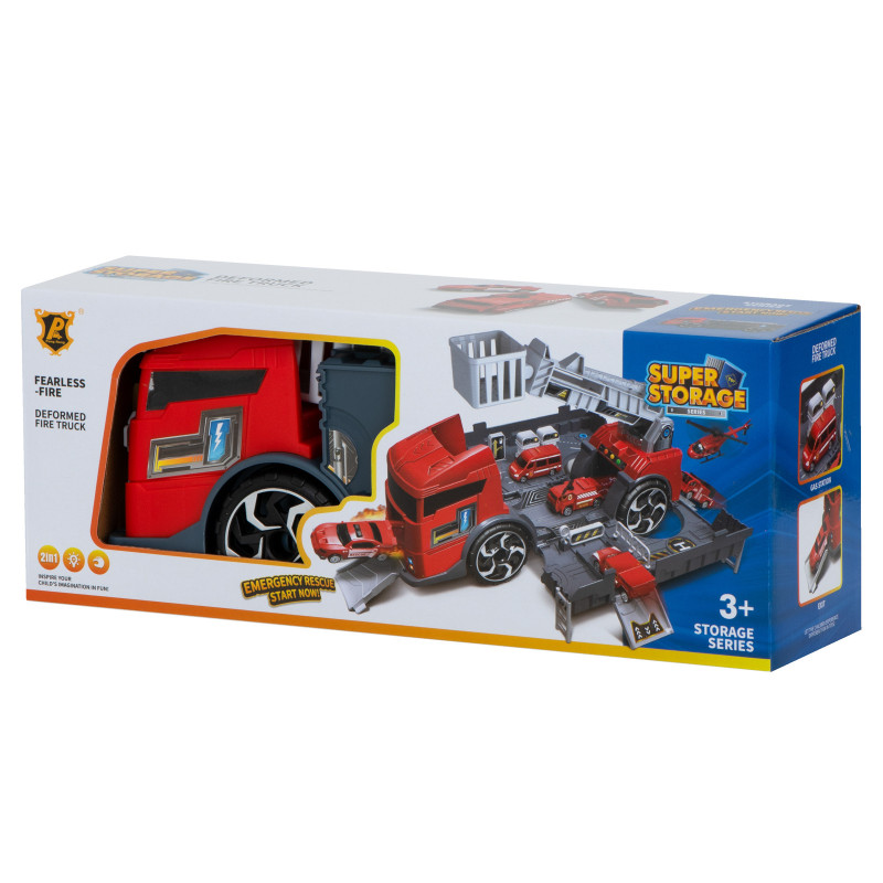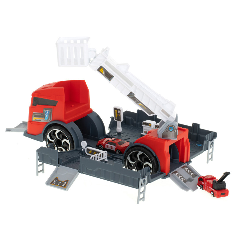 Nehoda? Požiar? Žiadny problém pre odvážnych hasičov vybavených ťažkou technikou! Dorazia na miesto zásahu v veľkom transportnom kamióne, ktorý slúži aj ako mobilná garáž a hracia stanica.