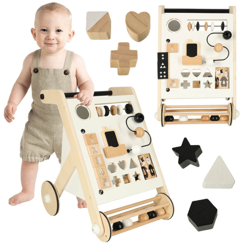 Drevené detské chodítko s interaktívnymi prvkami – prvé krôčiky s radosťou