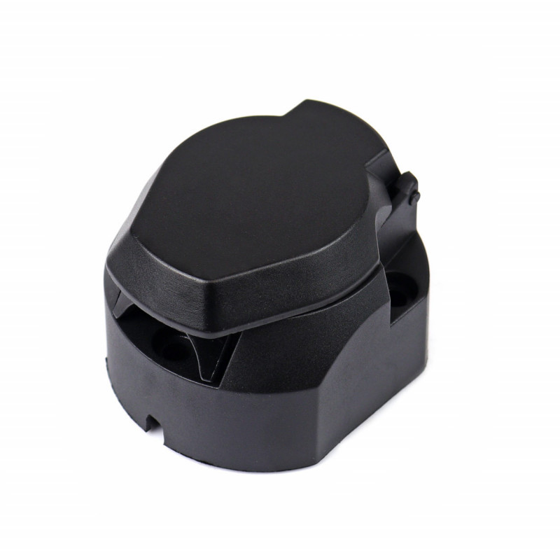 Zásuvka na prívesný vozík z pevného plastu so 7 pólovým pripojením a 12V napätím.